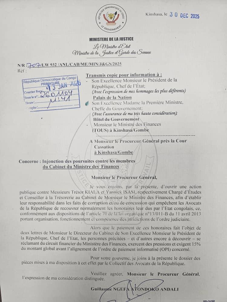 Dans une correspondance datée du 30 décembre 2025, le Ministre d’État, Ministre de la Justice et Garde des Sceaux, Guillaume Ngefa Atondoko Andali, a enjoint le Procureur Général près la Cour de Cassation d’ouvrir une action publique contre deux proches collaborateurs du Ministre des Finances.